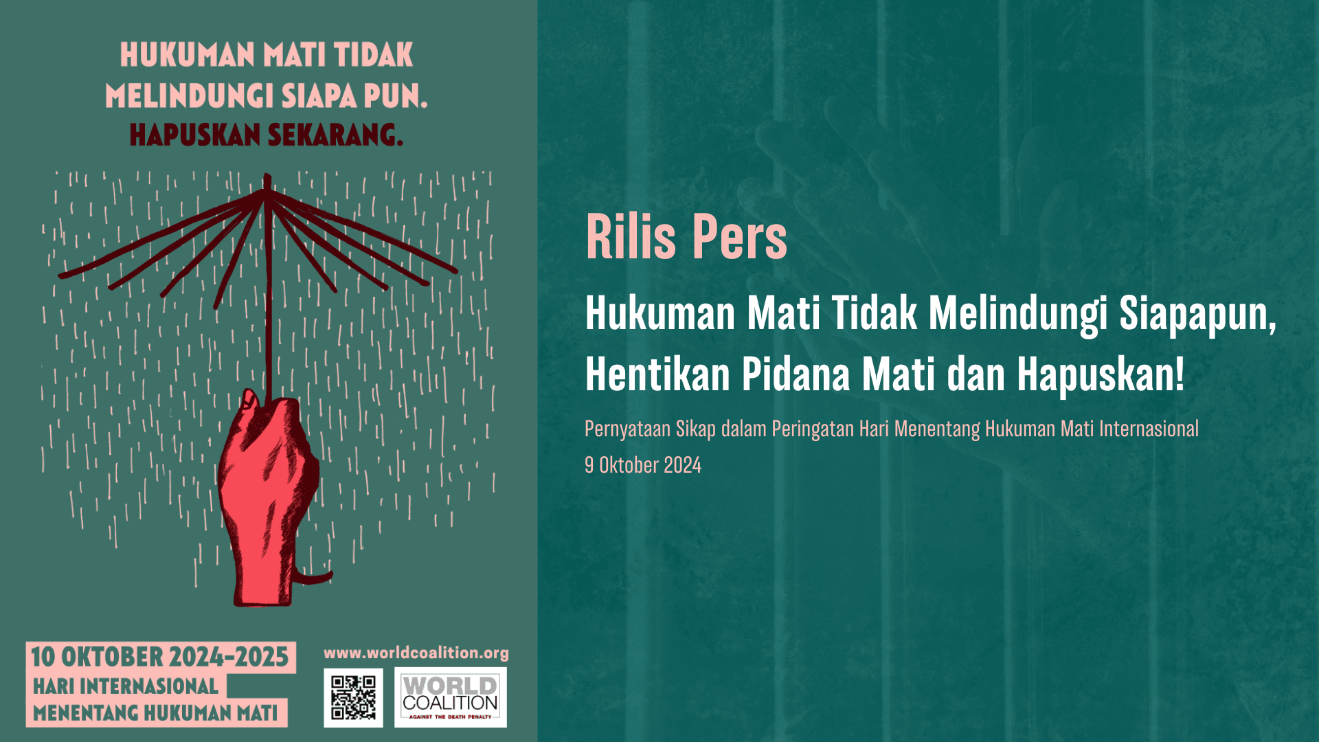 Setiap tanggal 10 Oktober, berbagai negara, organisasi, dan advokat di seluruh dunia bersatu dalam solidaritas untuk kembali menegaskan sebuah kebenaran universal bahwa setiap nyawa manusia berharga, dan tidak boleh ada orang yang harus menghadapi eksekusi mati sebagai bentuk penghukuman yang adil. Pada hari ini, kami Jaringan Tolak Hukuman Mati (JATI) dan Koalisi untuk Menghapus Hukuman Mati (HATI) yang terdiri dari berbagai kalangan aktivis, advokat, praktisi, tokoh agama, dan komponen masyarakat sipil lainnya turut bersolidaritas dan menyerukan diakhirinya praktik tersebut. Kami mengingatkan pentingnya hak hidup sebagai hak yang tidak bisa dikurangi dalam keadaan apa pun dan bahwa keadilan seharusnya adalah tentang rehabilitasi dan pemulihan, bukan pembalasan.