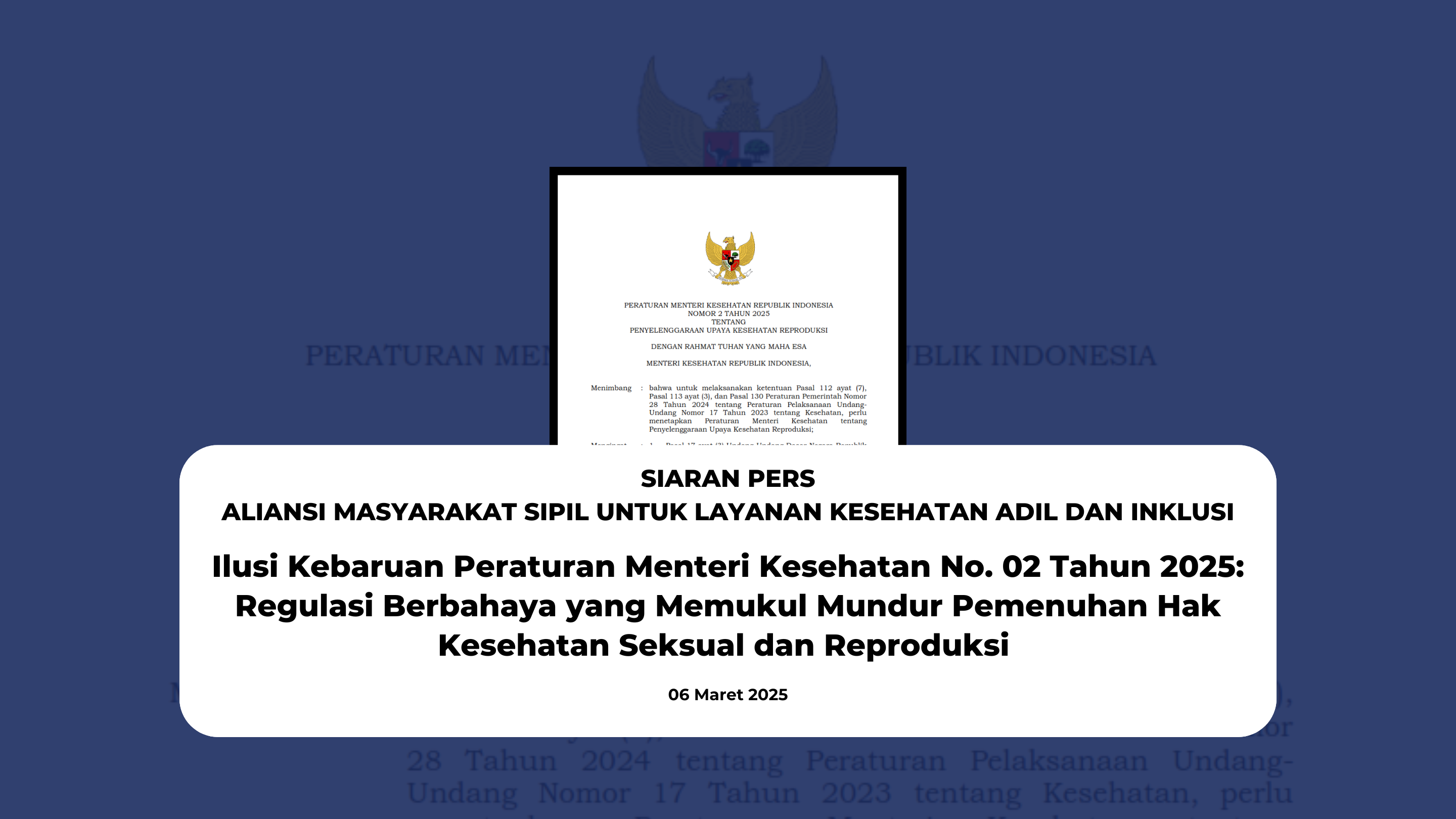 Kami, aliansi masyarakat sipil yang konsisten mengawal perkembangan aturan turunan pada UU Kesehatan No.17 Tahun 2023 serta aktif memberikan masukan pada proses penyusunan aturan turunan guna mendapatkan akses layanan yang adil dan inklusif 1, menyatakan keberatan atas substansi di dalam Peraturan Menteri Kesehatan No.02 tahun 2025. Keberatan ini utamanya kami tujukan pada pasal-pasal diskriminatif yang justru mencederai perlindungan kelompok rentan, menghilangkan otonomi tubuh tiap individu, serta menjauhkan korban dari akses layanan kesehatan yang terjangkau dan memulihkan.